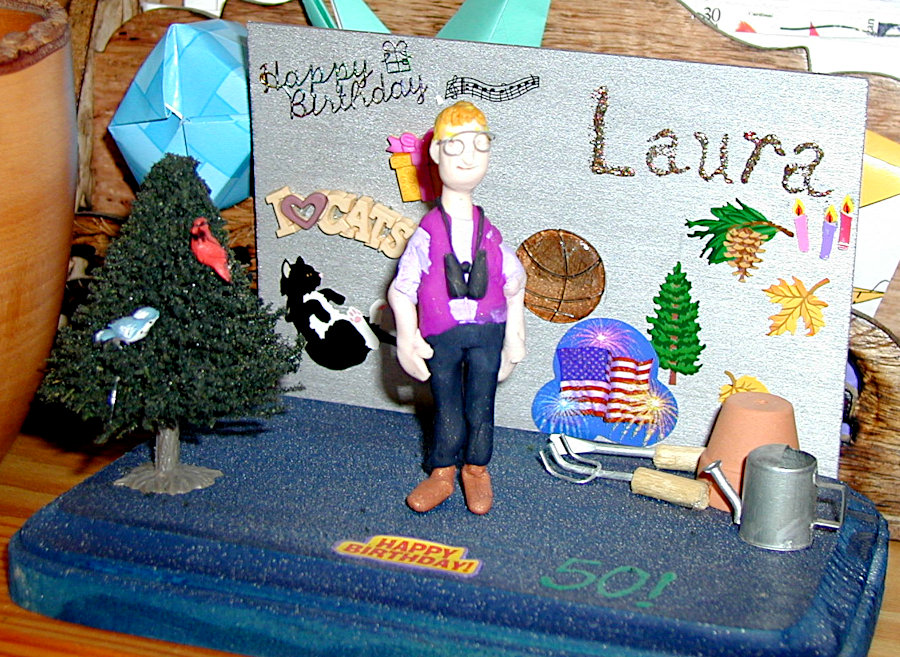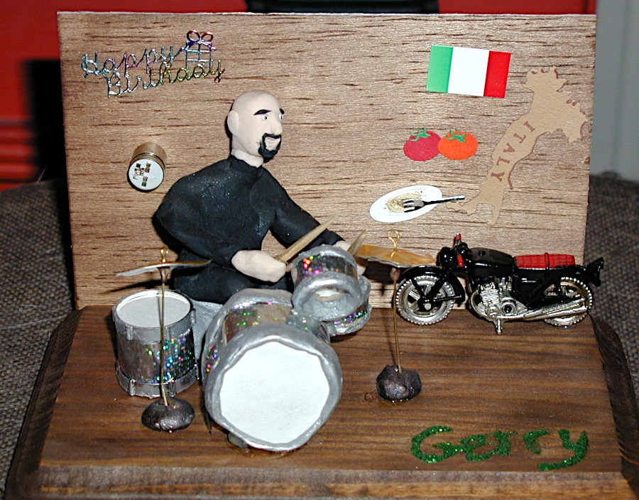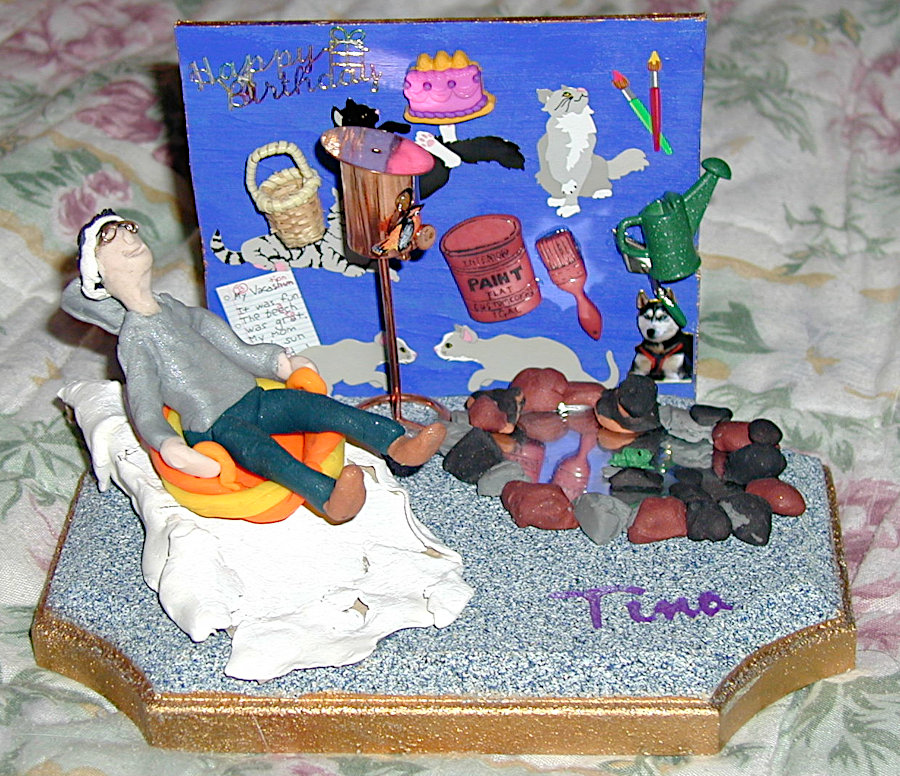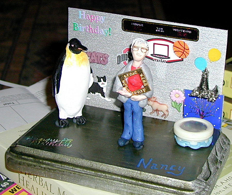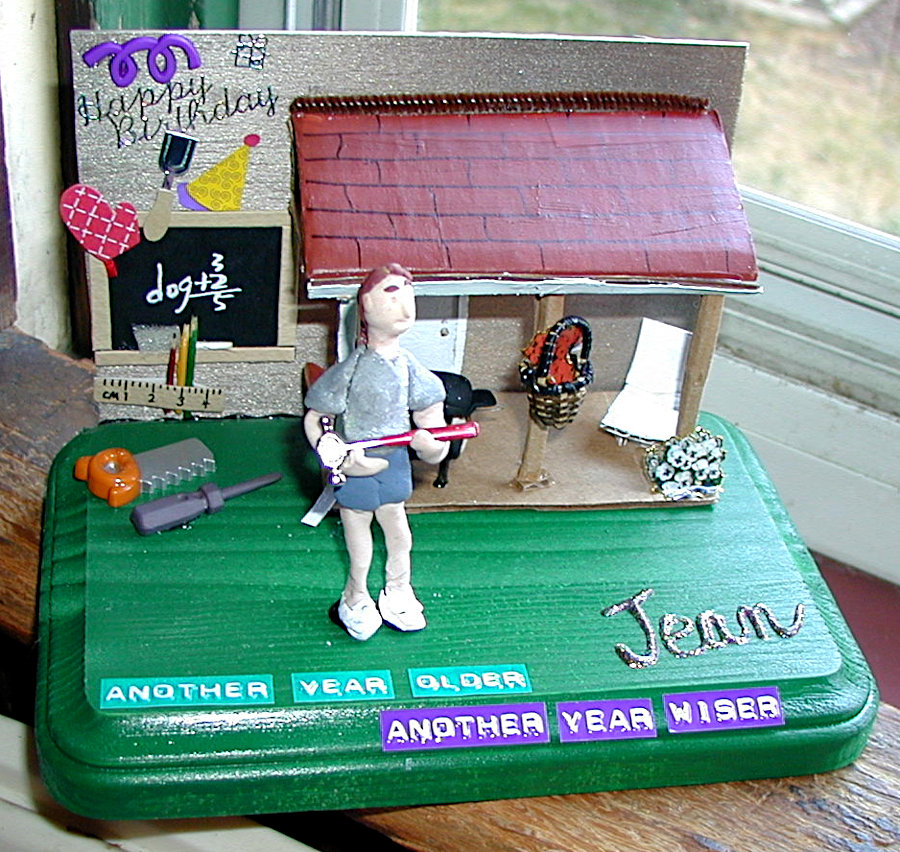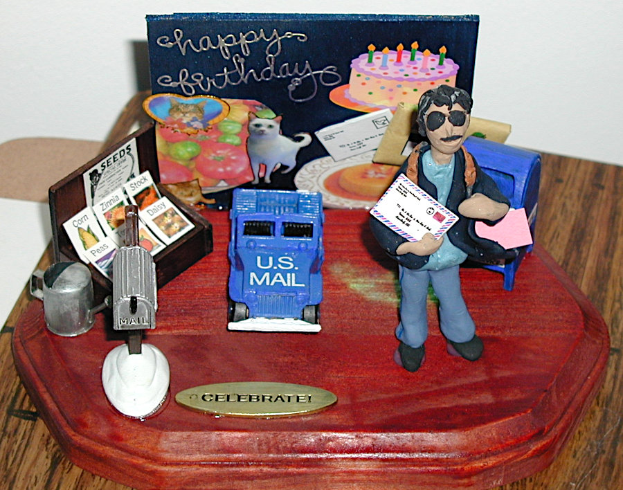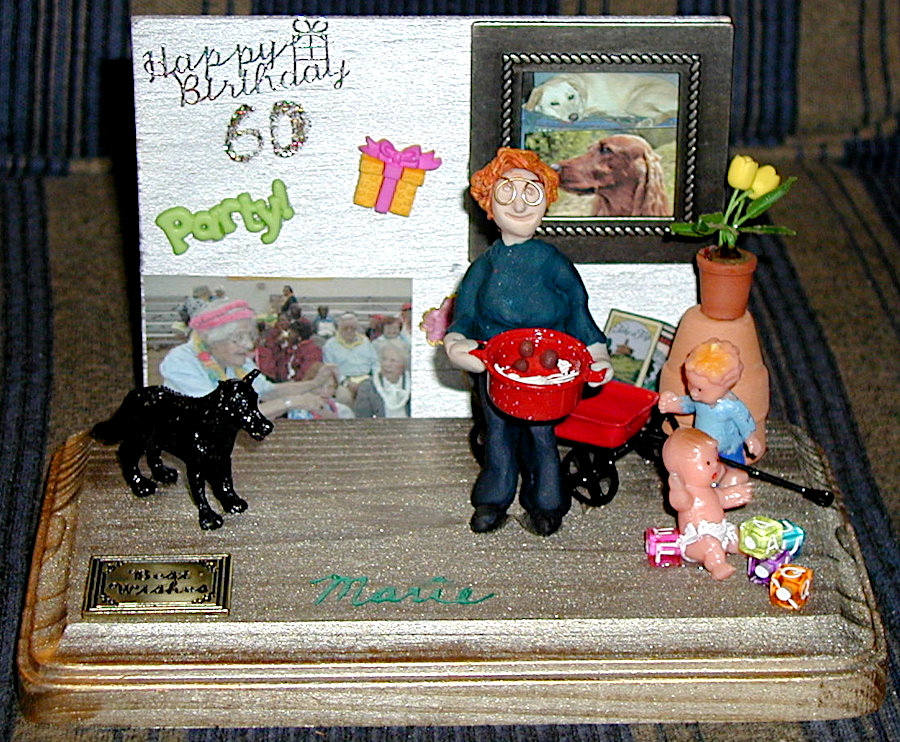 Gayle enjoyed making little dioramas of people for their birthdays and other special occasions such as anniversaries. They always contained a pretty good likeness of the individual along with items that represented their interests and hobbies and sometimes their profession. The recipients were always thrilled that Gayle not only made little “thems” but that she put forth time and effort to personalize it with their own particular interests. The photos below show you just a few of her creations. The last photo is of one that I made for Gayle; not nearly as good, but I felt it only fair that she should receive one also.